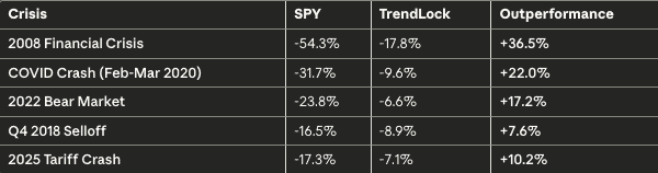 - Max Drawdown: -29.0% (TrendLock) vs -55.2% (SPY)