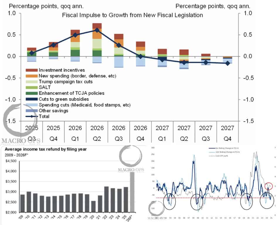 - Policy Inflection Point: The start of 2026 marks a key shift in policy, with fading tariff uncertainty and a reversal in fiscal impulse from a Q4 2025 drag (-0.6% of GDP) to an early 2026 tailwind (+0.5% to +0.9% of GDP) driven by the “One, Big, Beautiful Bill Act.”