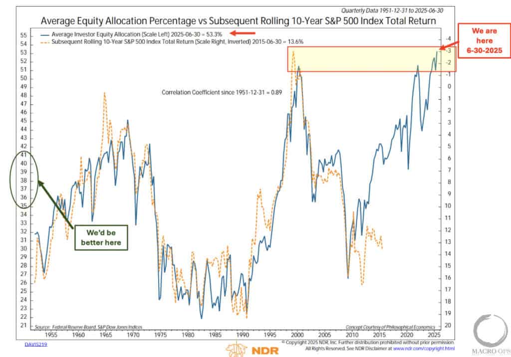 Household allocation to equities as a percentage of financial assets is at an all-time high (blue line). Historically, this is bad juju for the subsequent rolling 10-year returns (orange line) (NDR chart via CMG).