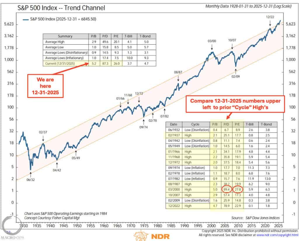 2. Record-high equity holdings go hand in hand with record-high valuations. Neither are timing tools, as each condition can persist for some time. But over a sufficiently long time horizon, valuations are the predominant driver of returns. As we head into 2026, both of these will increasingly become headwinds (NDR chart via CMG).