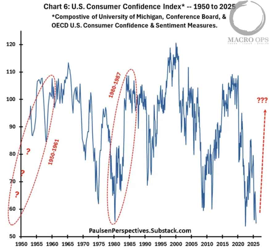 7. Jim Paulsen made the argument in a recent post (link here) that consumer confidence is as critical to stock market success as earnings, despite receiving far less attention. He highlights the current massive divergence between the two and draws parallels to the 1950s and 1980s, when stocks soared primarily on rising optimism. Consequently, Jim views a rebound in Main Street confidence as the likely “winning ticket” for 2026, positioning the S&P 500 for solid returns even if earnings growth remains flat.
