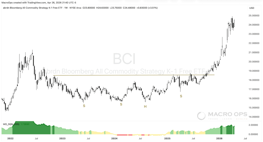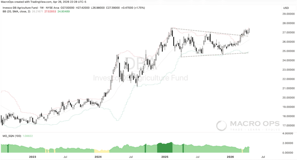 13. Invesco’s Agriculture fund (DBA) has broken out from its 12m compression regime. The macro backdrop remains highly supportive of Ags. We may initiate a starter long in DBA this week (chart is a weekly).