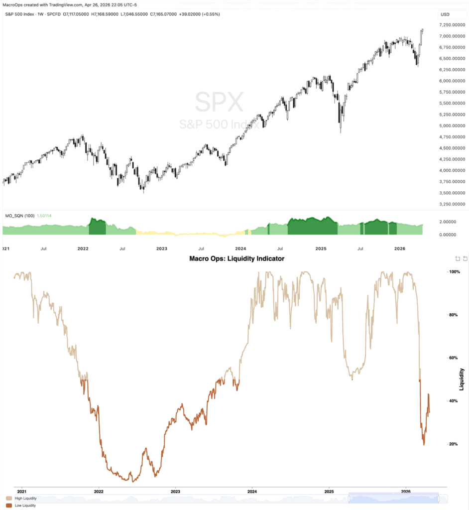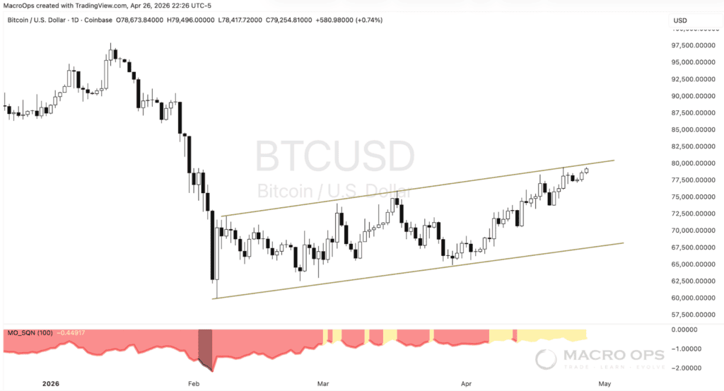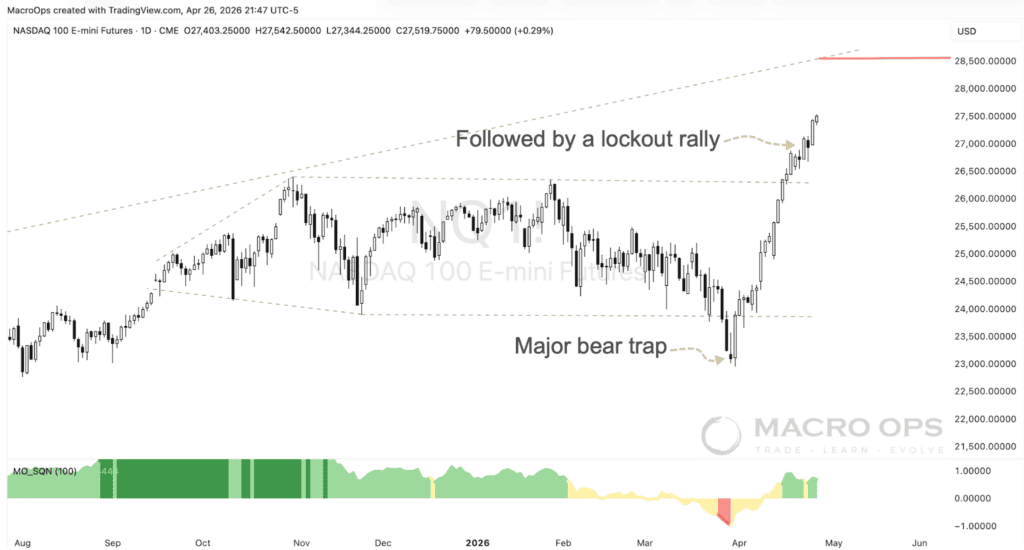 3. The NQ100 weekly is a great-looking chart. Tight 7-month sideways compression, textbook bear trap reversal, lockout bull market rally. We flipped long a bunch of AI/semi names on the reversal over the past two weeks — respect for the tape, plus the technical setups were there. Anthropic’s Mythos announcement — likely the most significant step-function model improvement in a while — is adding serious juice to the AGI narrative.