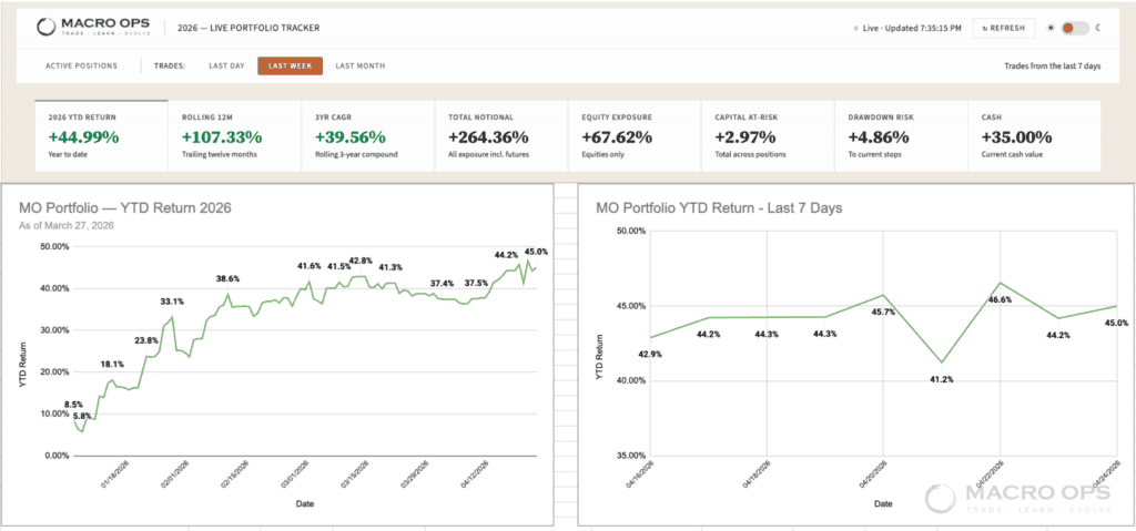 1. Portfolio rose +210bps last week, sitting at +45% YTD. Two weeks ago, following the bear trap reversal in the major indices, we began aggressively adding risk — reducing cash holdings from 65% to 35%.