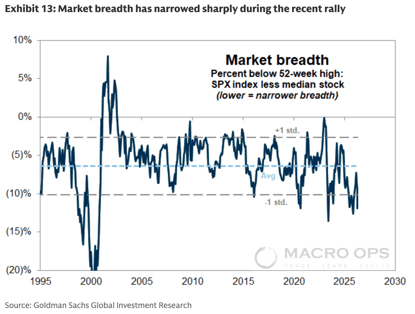 5. I’ll admit — it’s a strange market. Historic price thrust, but no confirming breadth thrusts. Breadth remains incredibly narrow (see next chart). And our Liquidity Gauge still sits sub-40%. That could change — Warsh is coming in soon, and maybe he starts jawboning rates down before taking the Fed’s helm. Anything can happen. We’ll keep a close watch on this one.