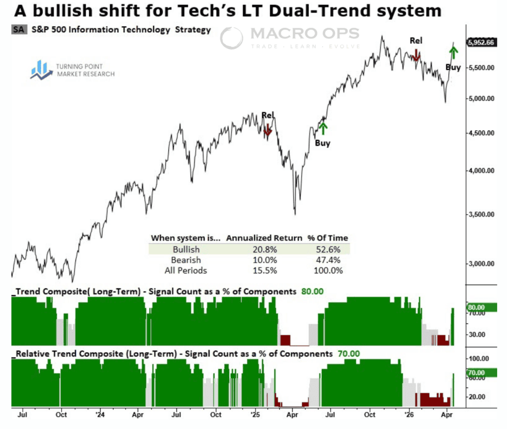 4. Dean Christians at Turning Point Market Research (link here) flagged last week that his long-term Dual-Trend system flipped bullish on S&P 500 information technology — annualized returns at this signal are strong.