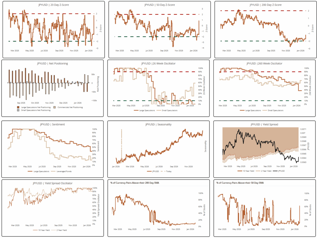 12. We’re quite short the dollar via long MXN & CHF, but we’re also interested in adding long JPY and NZD to that mix. They’re overbought in the near term, but the long-term setup is solid. Both have fairly crowded short positioning, strong yield-spread differentials/momentum, and expanding breadth from bombed-out levels. Charts from our multi-chart view in our HUD.
