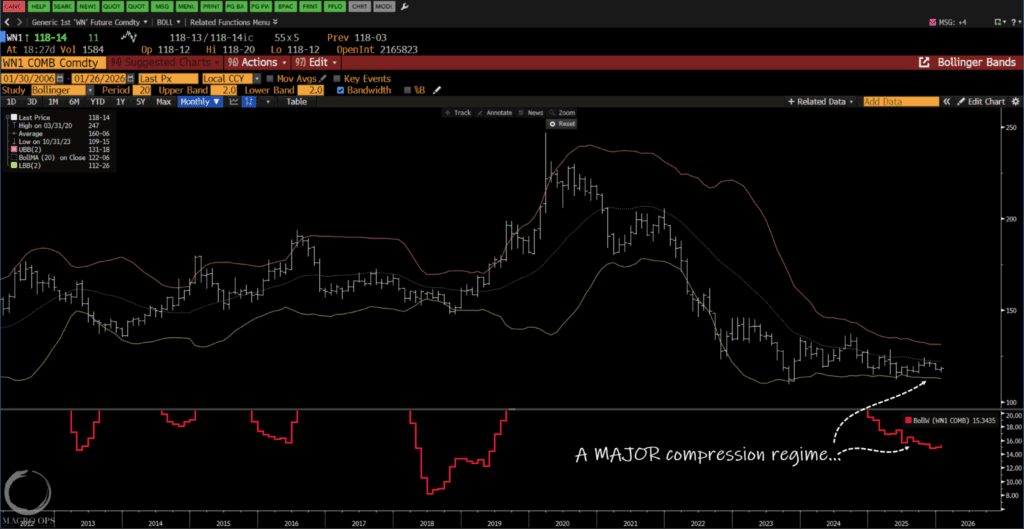 10. Now compression regimes are directionally agnostic. They don’t foretell whether the coming trend will be a bull or bear. But commodities tend to lead yields, as shown below with the BCOM Index in orange and 30yr yields in white. This tells me we’re likely in for a major steepener, with the front end staying pinned and the long end getting clobbered.