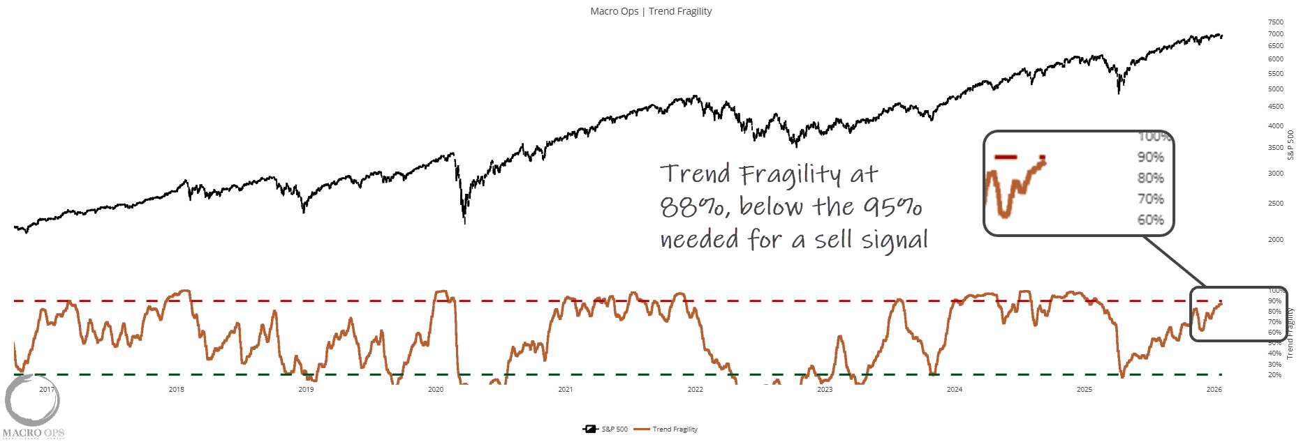 6. However, Trend Fragility is high and climbing. It hit 88% on Friday, which is still below the 95% level that triggers a formal sell signal. This is a conditional signal, so it’s not a reason to be bearish by itself (i.e., stay long but tighten stops).