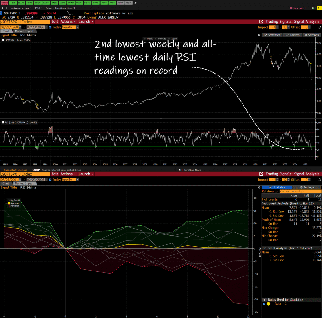 6. Obviously, the worst of this weakness has been concentrated in the Software sub-industry. The chart below shows the S&P 1500 Software sub-industry group vs. the SPX. As you can see, the past few months have been one of the most dramatic periods of relative underperformance on record, with the daily RSI hitting its lowest level ever and the weekly its second (97’ being the worst).