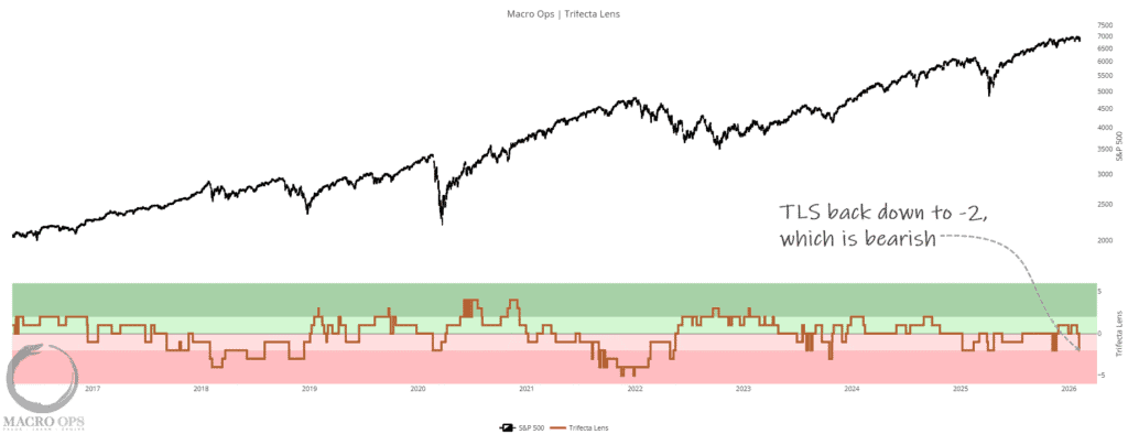 1. Our Trifecta Lens Score (a composite of macro, liquidity, technicals, and sentiment) fell to -2 last week, which is bearish. It was driven lower by a big drop in liquidity, which has flipped negative for the first time since Nov of last year.