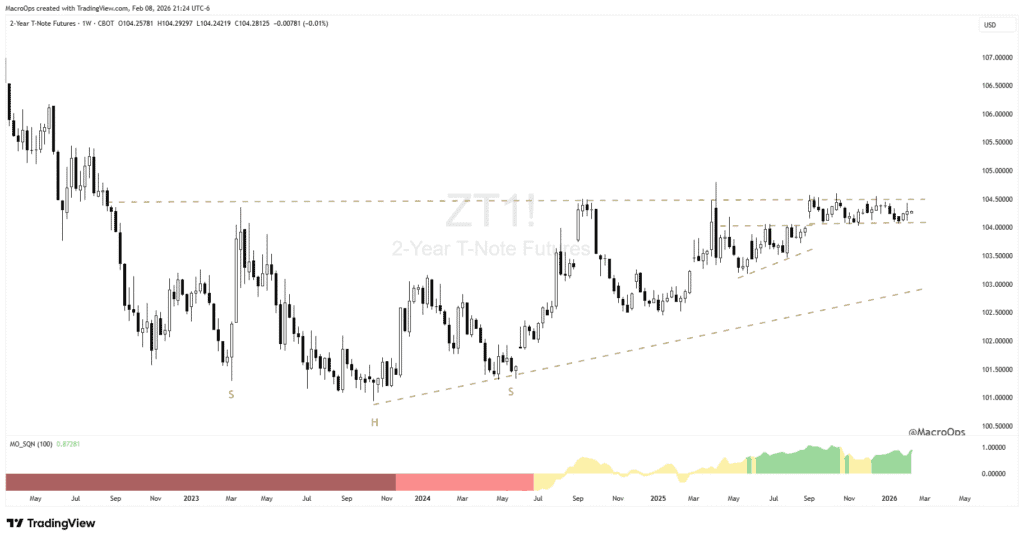 8. 2-year UST Notes continue to be one of the more interesting long-term setups I’m tracking. They’re in a major compression regime. Have put in a multi-year inverted H&S bottom. And are now consolidating right below the neckline in another compression regime. A big move is coming… My bias is up. We are long and will add aggressively on a breakout.