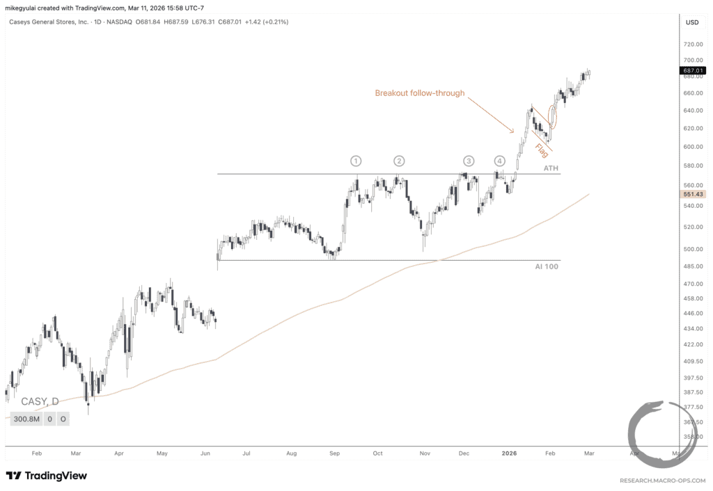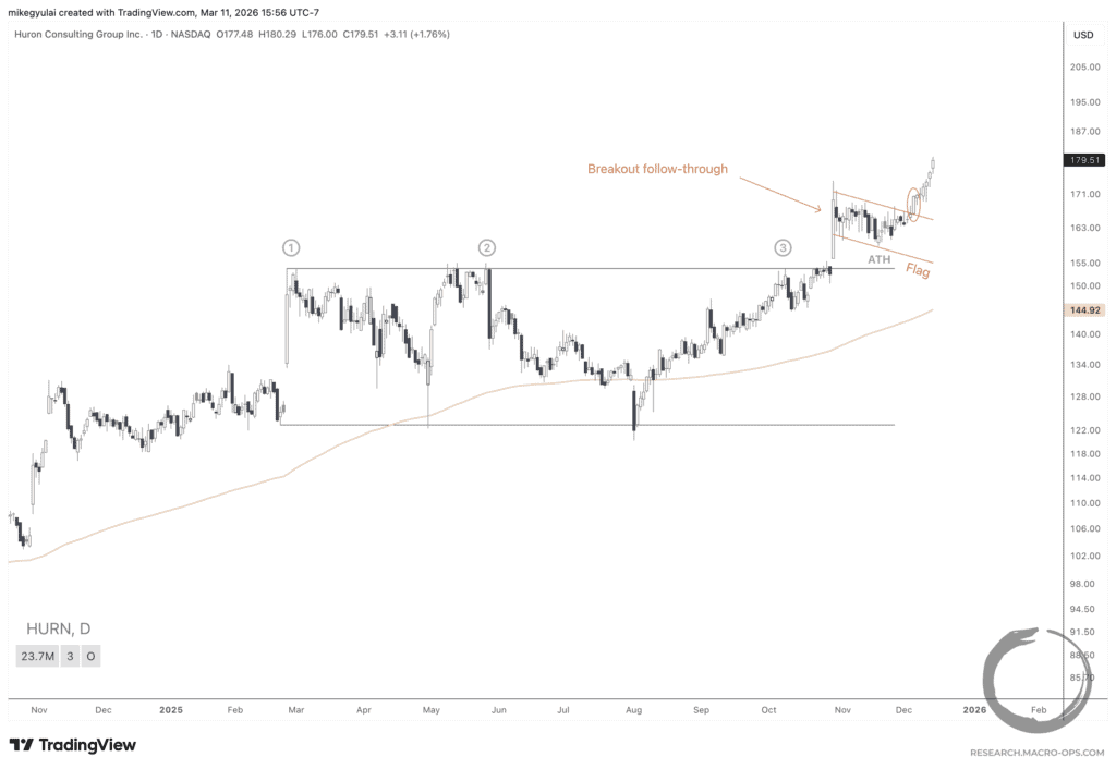Curiosity asked: “What if I defined a sub-universe of opportunities within my own active breakout positions: only those that had already surpassed 1R MFE and been held longer than a week? What if I screened for high bases and flags within those positions, using the sustained breakout as a favorable regime filter for the shorter-term setup?”