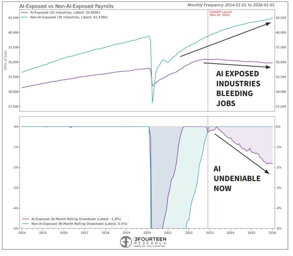 “AI’s impact on the labor market is no longer theoretical. In the most AI-exposed industries, job losses are accelerating — especially relative to pre-AI trend growth. AI-resistant industries continue to add jobs. As the year progresses, expect that wedge to grow.”