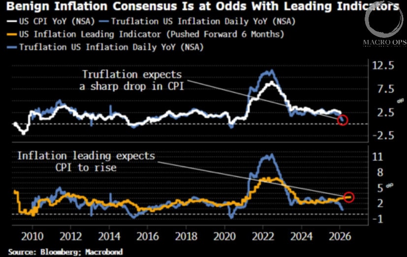 9. Whichever side ends up being right will have profound implications for markets. The AI-eats-most-jobs scenario is obviously deeply deflationary. The other is potentially quite inflationary. Our models continue to point to falling inflation over the next three months or so, with a potential hockey-stick turn somewhere in the second half of the year. This chart from BBG’s Simon White seems to corroborate that — Truflation (blue) collapsing while his inflation lead (yellow) trends up.