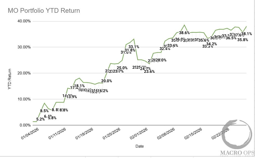 1. The MO portfolio gained +90bps last week, helped by our silver and miners longs. It’s now up +39.58% ytd. We’ll see where things open Monday, but I’d expect our long oil calls to be up nicely.