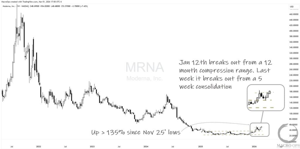 12. Check out this weekly chart of Moderna (MRNA). It broke out from a 12-month rectangle in mid-January and cleared its recent consolidation last week. Our resident systematic chartist, Mike ,G first flagged the setup on January 17th (link) — also, here’s the link to Mike’s latest. It’s definitely worth a read.