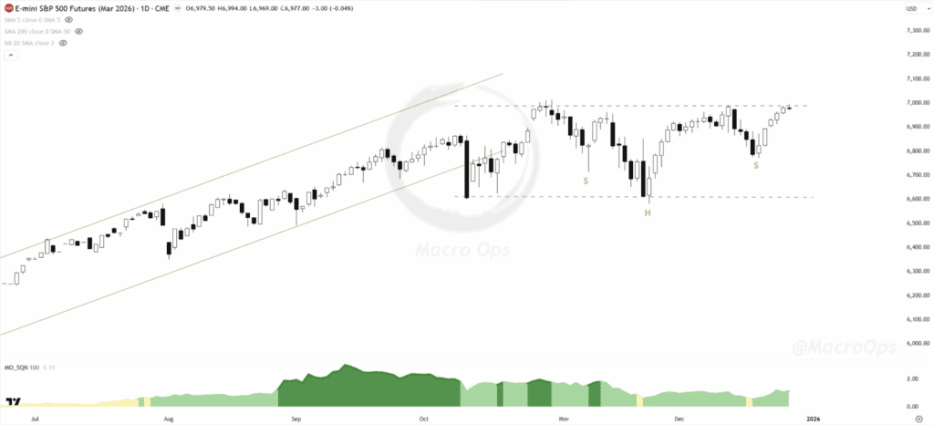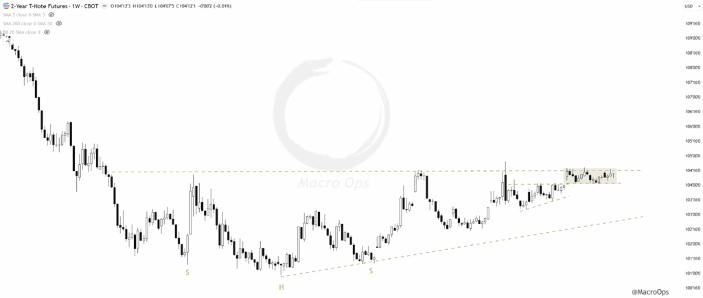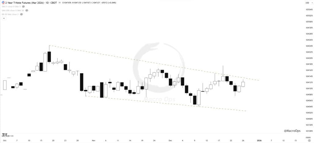 10. Trump is expected to announce his pick for the new Fed chair sometime in early January (Kalshi has Hassett at 41% and Waller at 34%). The 2yr UST Notes continue to compress in a tight trading range right below the neckline of a 3yr+ inverted H&S bottom. The second chart shows the March contract on the daily. We’re interested in playing the longside on a breakout from this range.
