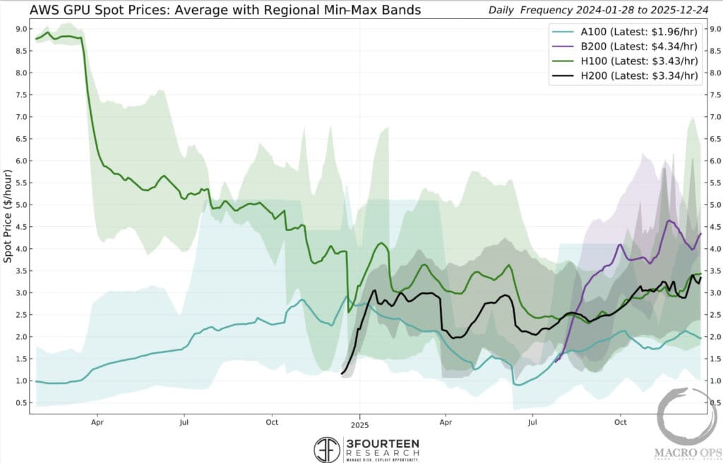 @fernavid shared this interesting data point, writing “Spot GPU prices at AWS rising across all GPU vintages for the last few months, all while the “AI-bubble” ‘ hand-wringing reached a fevered pitch. Remember, some bubblers say rental prices should be in permanent decline from oversupply and obsolescence.”