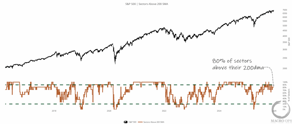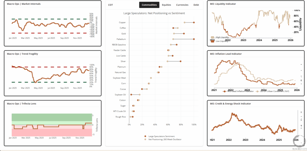 4. Trend Fragility (a measure of sentiment and positioning) is elevated but still below levels that trigger a sell signal. Market internals are strong and trending in the right direction, liquidity is flush, and our Trifecta Lens indicator (a composite of everything) is at +1, its highest reading since Oct of 2024.