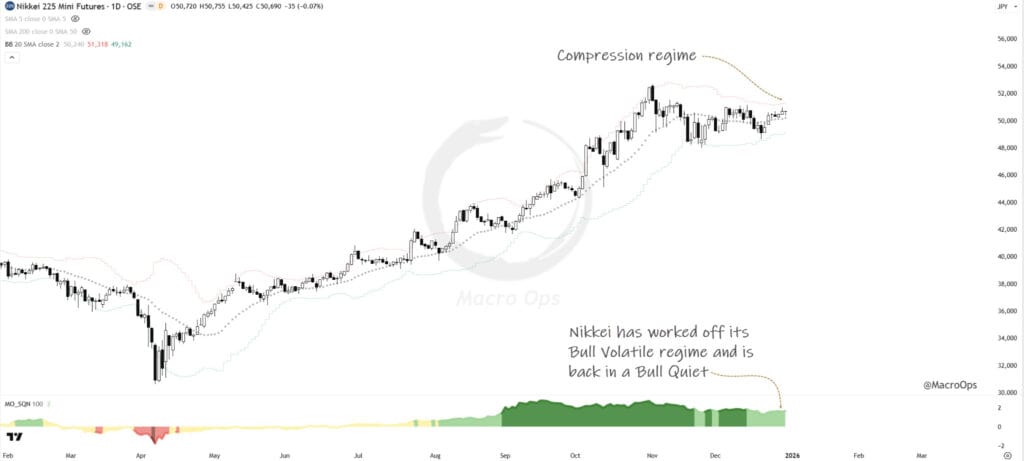 8. Japan’s Nikkei is setting up in a nice compression regime. It’s worked off its Bull Volatile levels and is back to trading firmly in a Bull Quiet. Its monthly chart is a beauty and suggests another strong bull leg is on the way (chart is a daily).