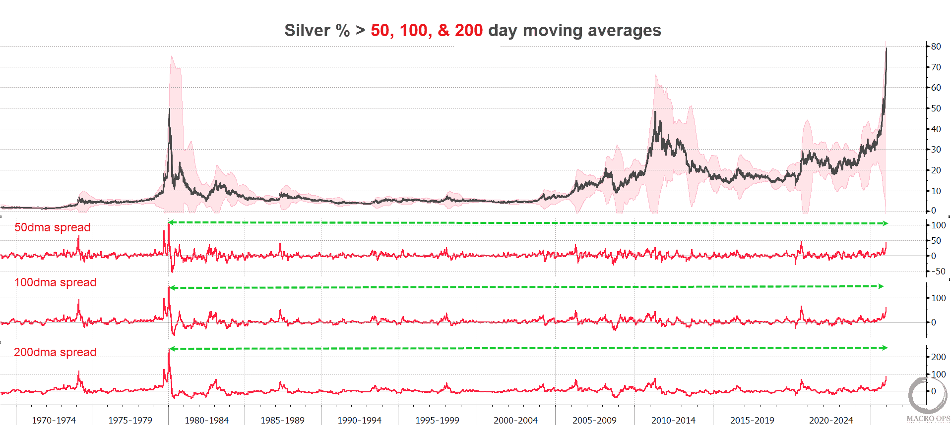 Everyone is talking about how overextended silver is. And indeed, it is. We will see a smashing correction at some point (maybe it begins tomorrow, or another two months, who knows). But… as 1979 shows, the current levels of overboughtness can, well… become a LOT more overbought.