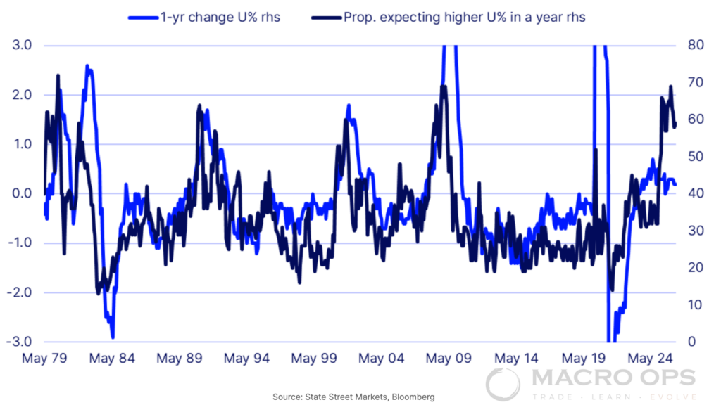 9. More importantly, if we don’t see resolution soon, recession risk starts getting priced in. Central banks are laser-focused on wages becoming the next inflation problem — but the labor market may not even be strong enough to get there. Meanwhile, unemployment has looked stable on the surface, but household sentiment is telling a very different story. The latest Michigan survey has unemployment fears running at recession-level readings (chart via StateStreet).