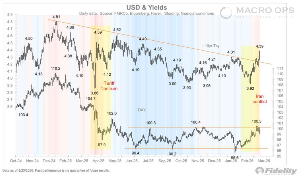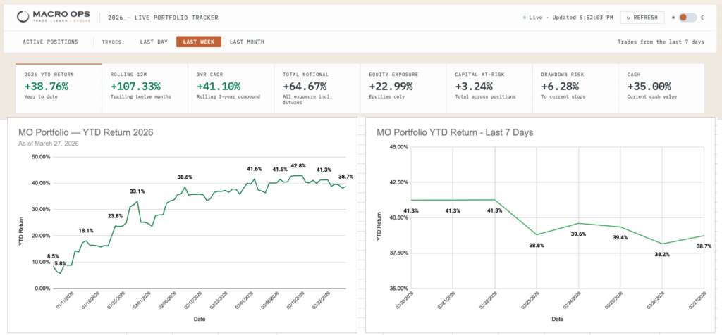 My teammate and MO resident Vol expert, Tony, discusses this idea in length in his latest Vol-Street Journal video (link here). He flags two things worth highlighting: SPX and NDX are both breaking out of their compression regimes on the daily and weekly — and doing it with real momentum. He’s also been watching VIX futures track spot VIX much more closely than they did at the start of the war, which he reads as vol traders not pricing in a quick reversion.