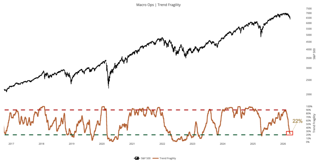 Summary: Trend Fragility is knocking on the door at 22% — need one more push below 20% to trigger a conditional signal, but we’re not there yet. Key word: conditional. Tape and internals still need to confirm. The one bright spot is breadth actually ticked up last week, but that’s a thin reed to hang your hat on. Meanwhile, the options market has flipped fully negative gamma — dealers are now chasing price in both directions, which means expect the moves to get bigger from here. Base case remains that we’re carving out a larger volatile sideways range, with a cyclical top increasingly on the table depending on how the geopol situation develops. As always, the data leads.