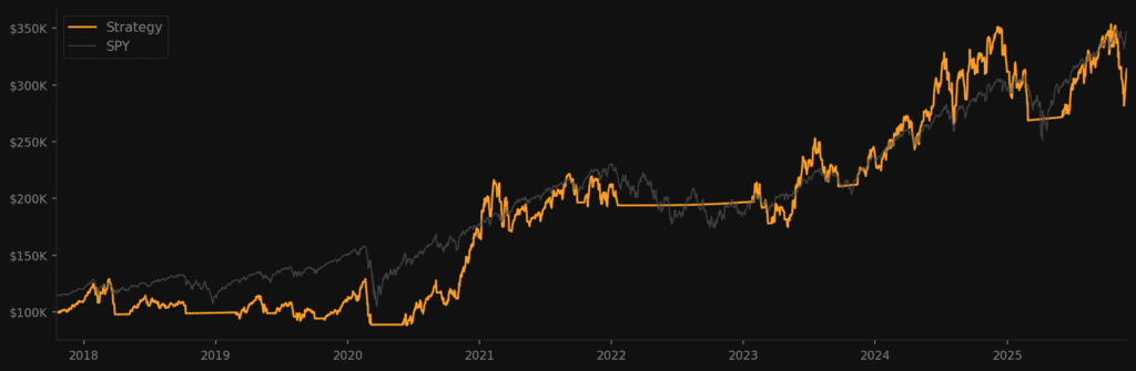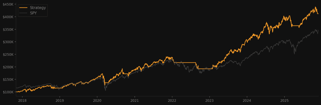 ~30% CAGR on its own. One trade per month. Different timeframe, different logic, different source of returns.