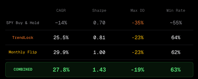 TrendLock alone: -23% max drawdown. Monthly Flip alone: -23% max drawdown. Combined: -19% max drawdown.