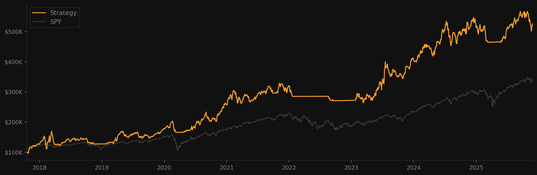 ~30% CAGR on its own. One trade per month. Different timeframe, different logic, different source of returns.