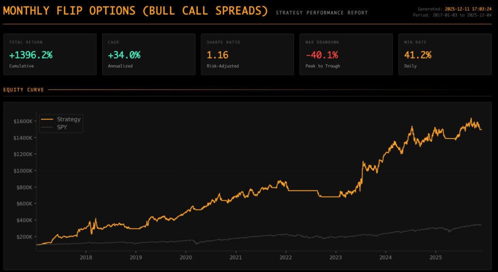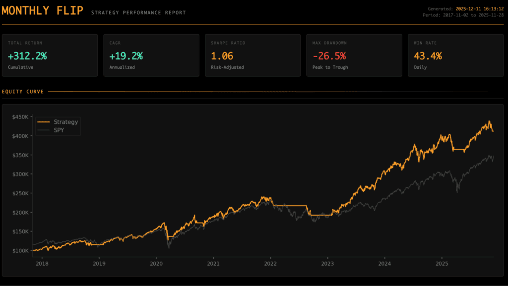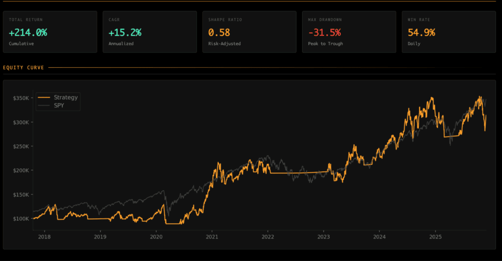 Compare that to buy-and-hold SPY: ~10% annually with 33%+ drawdowns and a Sharpe around 0.5.